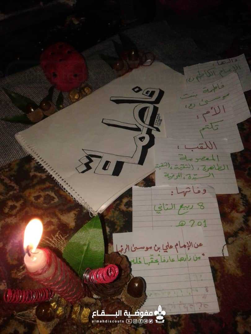 أحيا فوج السيدة صفية/قطاع الولاية ذكرى استشهاد السيدة فاطمة المعصومة عليها السلام، بتلاوة آيات من القرآن، فسرد ابرز محطات حياتها المباركة، وبعدها كانت فقرة فنية واشغال يدوية...