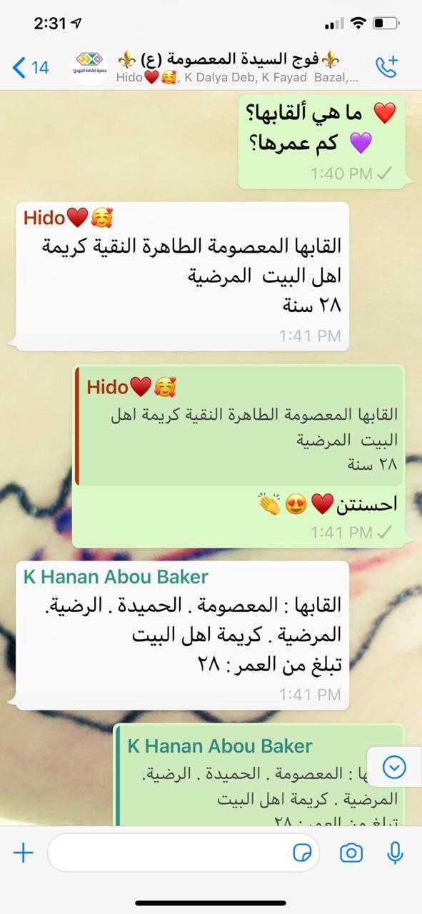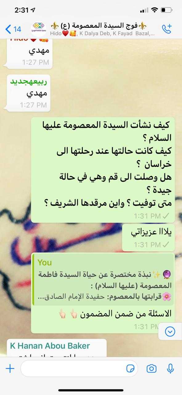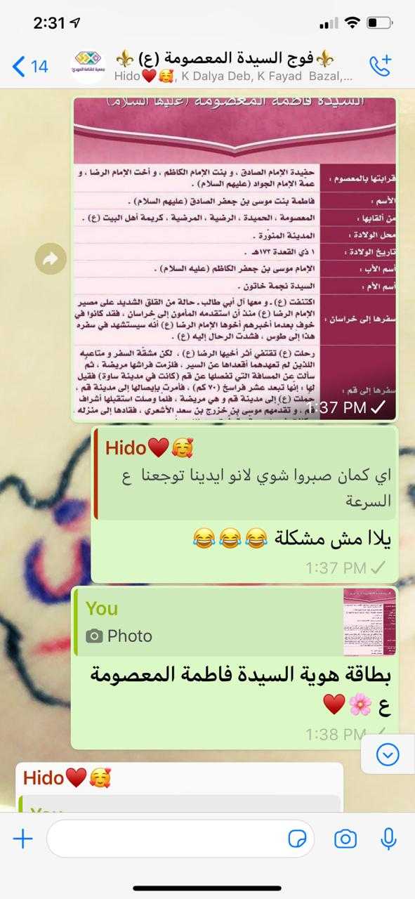 أقام فوج السيدة المعصومة/ حوش السيد علي/ قطاع الهرمل نشاطه الاسبوعي في اجواء ولادة السيدة المعصومة عليها السلام، فبعد الافتتاح الرسمي تنوعت الفقرات فتعرفت الكشفيات على هوية ا لسيدة المعصومة عليها السلام، ومن ثم نبذة مختصرة عن حياتها قرابتها من المعصوم بالإضافة تقديم لمقامها الشريف مجموعة من الاعمال المستحبة كقراءة الزيارة وصلاة ركعتين صلوات على محمد وآل محمد، تسبيحات وختامها دعاء الحجة بمشاركة 35 كشفية.