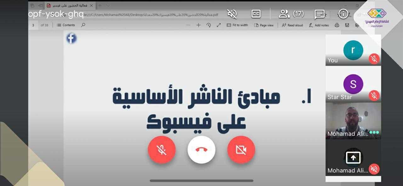 نفذت مفوضية بيروت "ورشة الفضاء المجازي" عن بعد، قدمها امين الاعلام الالكتروني القائد محمد رعد تخللها التعريف ببنية مواقع التواصل خاصة الفيسبوك وتويتر وكيفيّة العمل عليهما والتفاعل الانسب بمشاركة ١٧ قائد من مختلف الافواج والقطاعات الكشفية عبر برنامج google meet وسط تفاعل من كافة المشاركين.