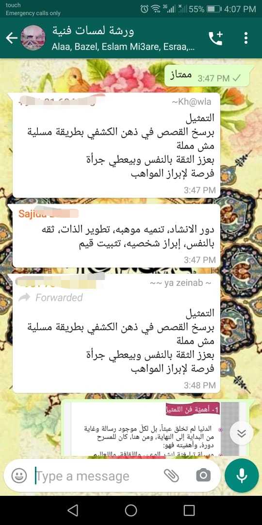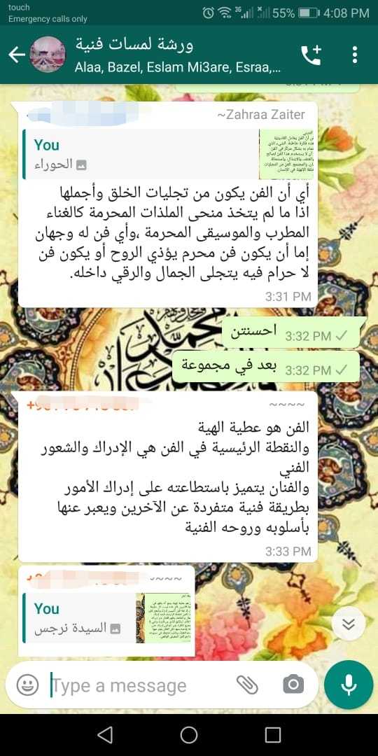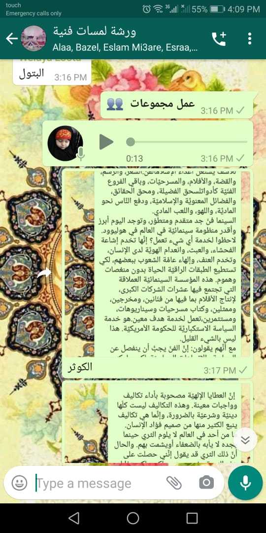 36 قائدة كشفية من القطاع الشمالي شاركن في ورشة لمسات فنية التي نفذتها أمانة الفنون في مفوضية مرشدات البقاع لهن عبر تطبيق الواتساب... تعرفت المشاركات من خلال الورشة على الفنون المعتمدة في الجمعية، بعض من اقوال الامام القائد عن الفن واهميته، كما وشرحن اهمية الفنون المعتمدة ودورها في تنمية مواهب الافراد...