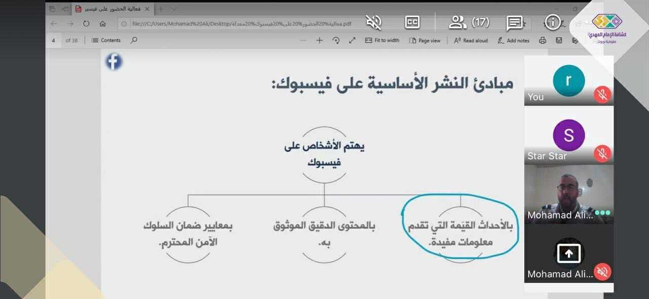 نفذت مفوضية بيروت "ورشة الفضاء المجازي" عن بعد، قدمها امين الاعلام الالكتروني القائد محمد رعد تخللها التعريف ببنية مواقع التواصل خاصة الفيسبوك وتويتر وكيفيّة العمل عليهما والتفاعل الانسب بمشاركة ١٧ قائد من مختلف الافواج والقطاعات الكشفية عبر برنامج google meet وسط تفاعل من كافة المشاركين.