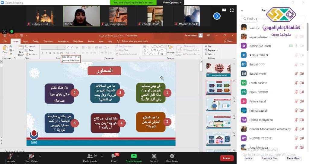 لأن في صحتها تتعزز صحة مجتمع بأكمله استهدفت مفوضية المرشدات في بيروت وبالتعاون مع الهيئة الصحية الاسلامية أكثر من ١٠٠ ام وقائدة بورشة تحت عنوان \"الوقاية من كورونا\" عبر برنامج الZoom