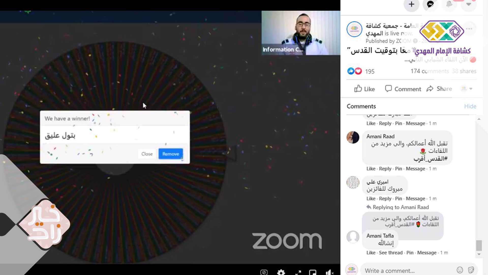 اللقاء الذي قدَّمه أمين الإعلام الإلكتروني القائد محمد علي رعد عبر تطبيق Zoom وصفحات الفايسبوك للجمعيّة ومنتدى مهدي الكشفي والمناطق، شارك فيه ما يزيد عن 2000 مشارك ومشاهد، واختتم بسحب قرعةٍ لأسماء المشاركين وتوزيع 3 هدايا لهم تقدمة دار المعارف الإسلاميّة.