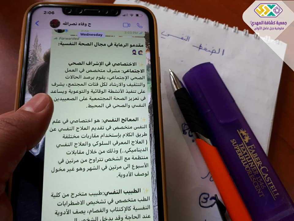 قدمت الورشةالمشرفة الصحية الإجتماعية المدربة ملاك شامي عبر تطبيق الزوم حيث عرّفت الضغط النفسي، عوارضه، كيفية معالجته، من هم الاشخاص المحتاجين للمتابعة، وما هي مواصفات مقدمو الرعاية في مجالالصحة النفسية، كما قدمت المدربة عدد من الأنشطة المساهمة في التفريغ النفسي.