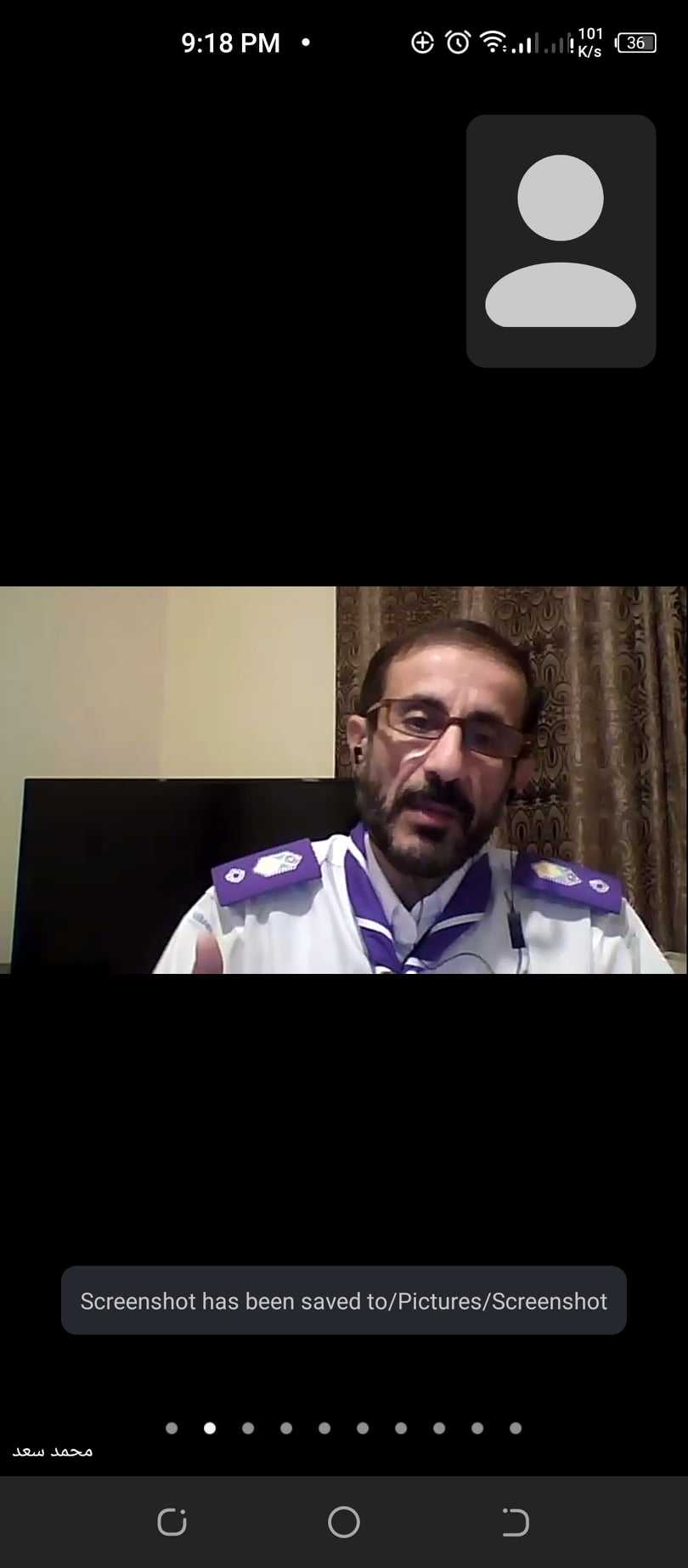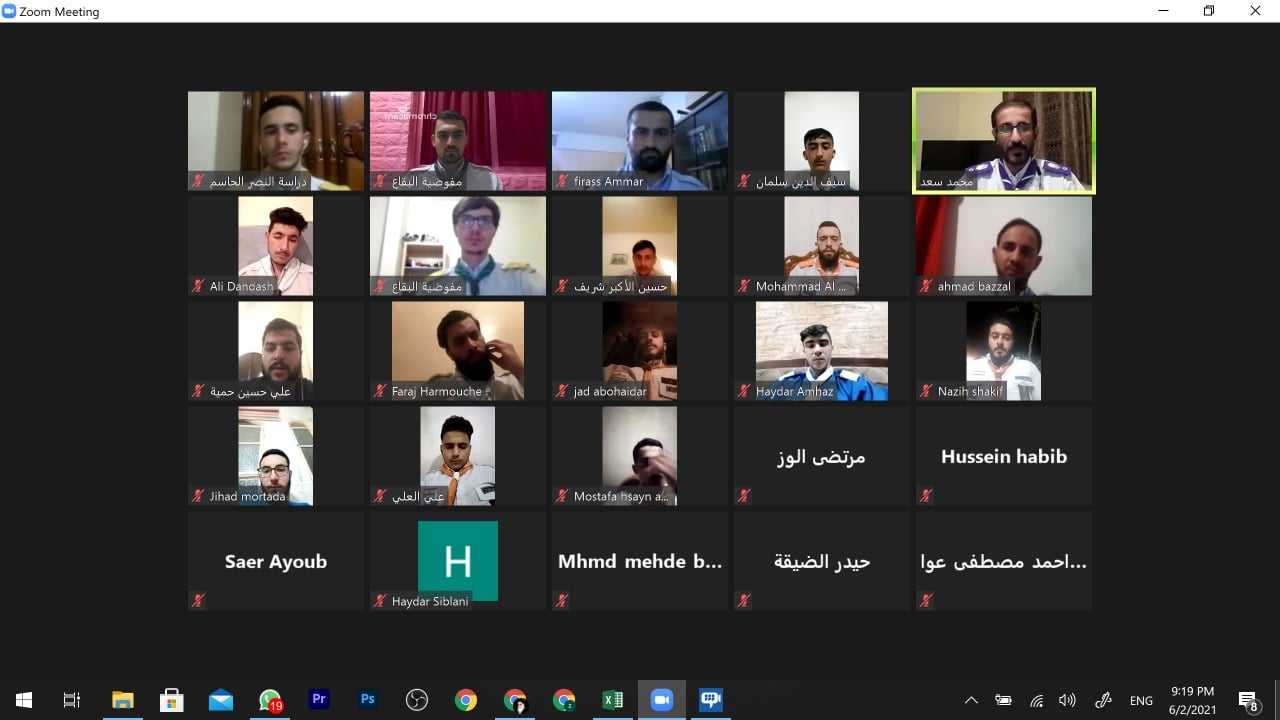 في وقت واحد وعلى شاشة واحدة اجتمع المتدربون أمام معاون مفوض العام الشيخ محمد سعد الذي رعى حفل الاختتام، وبعد تأدية مراسم الاحتفال تلاوة القرآن الكريم والنشيدين الرسميين الوطني اللبناني ونشيد الجمعية كانت كلمة راعي الحفل الذي أكد على هدفية مشاركة الشباب بتنشئة أفرادنا وموصياً اياهم ان يقدموا ما تعلموه لمن ينتظرهم وان يستمروا بذات الهمة والروحية.