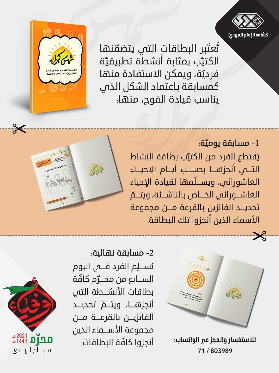 كذلك يمكن للقادة والقائدات الاستفادة من بطاقات الأنشطة التي يتضمنها الكتيّب بحيث تُعتبر كل بطاقة بمثابة أنشطة تطبيقية فردية، ويمكن الاستفادة منها كمسابقة باعتماد الشكل الذي يناسب قيادة الفوج، إما مسابقة يومية: يقتطع الفرد من الكتيب بطاقة النشاط التي أنجزها بحسب أيام الإحياء العاشورائي ويسلّمها لقيادة الإحياء العاشورائي الخاص بالناشئة، ويتمّ تحديد الفائزين بالقرعة من مجموعة الأسماء الذين أنجزوا تلك البطاقة. وإما مسابقة نهائية: يُسلّم الفرد في اليوم السابع من محرّم كافة بطاقات الأنشطة التي أنجزها ويتم تحديد الفائزين بالقرعة من مجموعة الأسماء الذين أنجزوا كافة البطاقات.