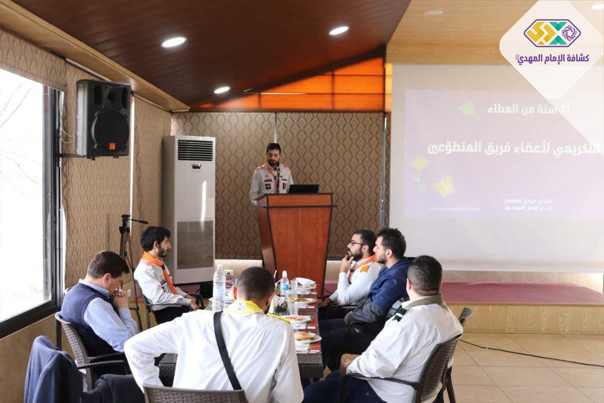 11 عامًا من العطاء اختُصِرت بلقاءٍ قدّمت خلاله أعمالٌ حيكت خيوطها من نور الشمس لتقدّم إلى رئيس جمعيّة كشافة الإمام المهدي (عجّل الله فرجه) وتسير تحت رايته نحو الأمل الموعود، بلقاءٍ تكريمي جمع المتطوعين في منتدى مهدي الكشفي بحضور رئيس الجمعية القائد نزيه فياض، مفوضة البرامج العامة، أعضاء مفوضيّة البرامج، ومديرة منتدى مهدي الكشفي والأعضاء المتطوعين.