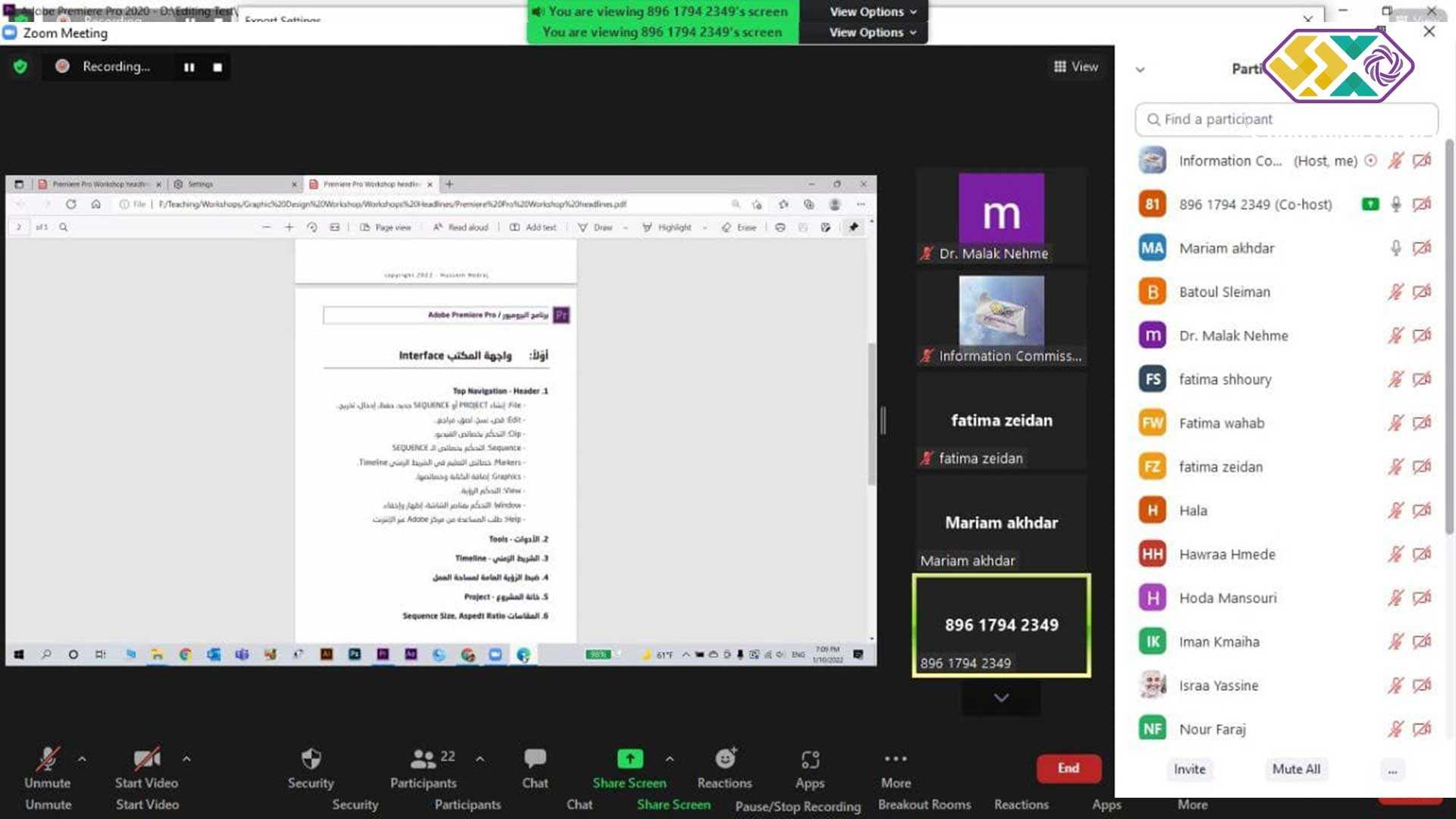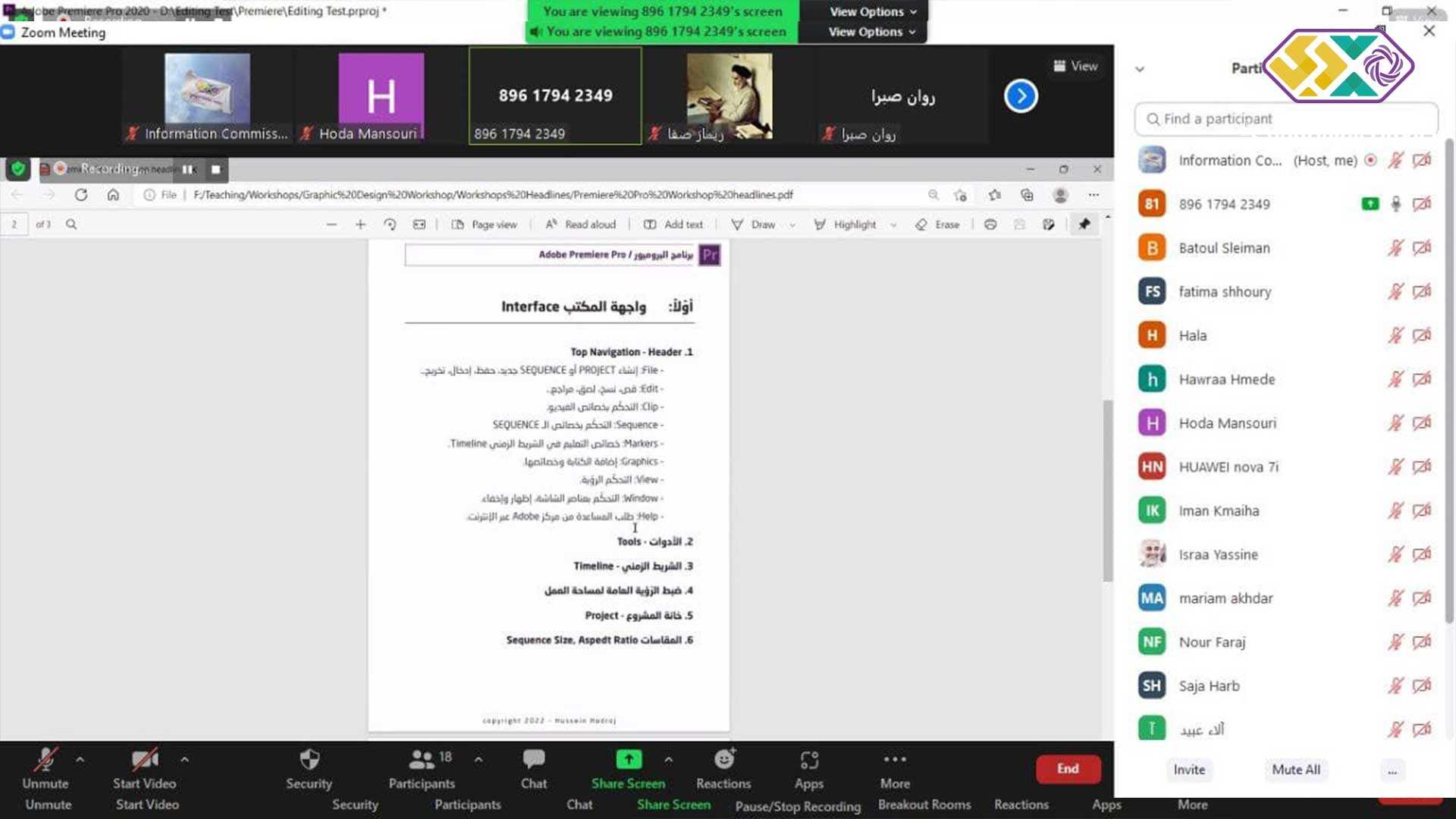 نُفذت الدورة عن بُعد عبر برنامج zoom، وخلالها تعرفت المُشاركات على أساسيات برنامج adobe premiere، والواجهة الأساسية فيه، إضافةً إلى الأدوات والشريط الزمني وضبط الرؤية العامة لمساحة العمل والمقاسات وغيرها من العناوين المهمة في عالم المونتاج أبرزها المؤثرات والكتابة وتعديل الألوان وميكساج الصوت والتخريج. كما طبقت المتدربات كل المهارات التي تعلمنها من خلال إنتاج فيديوهات قصيرة.