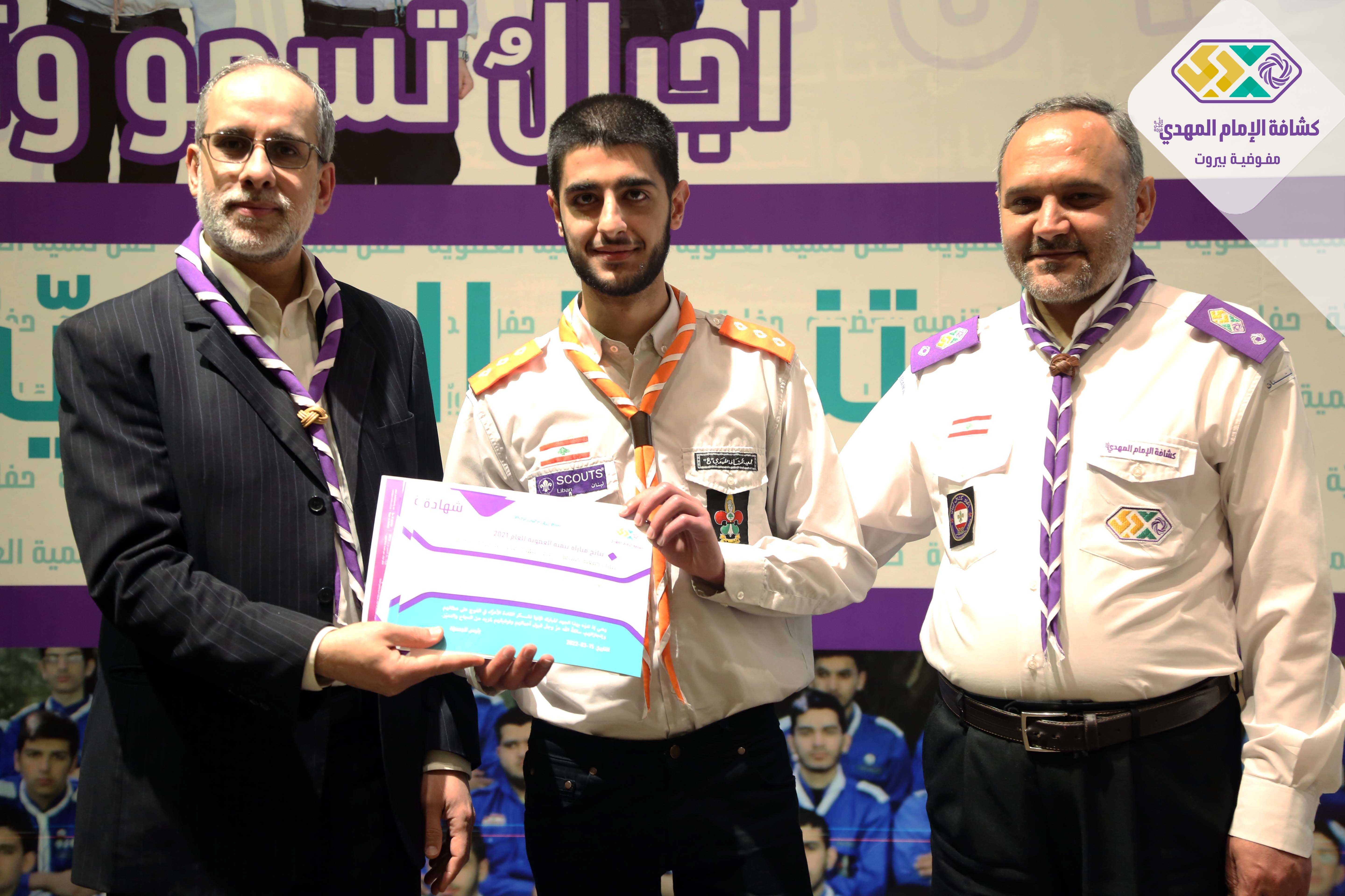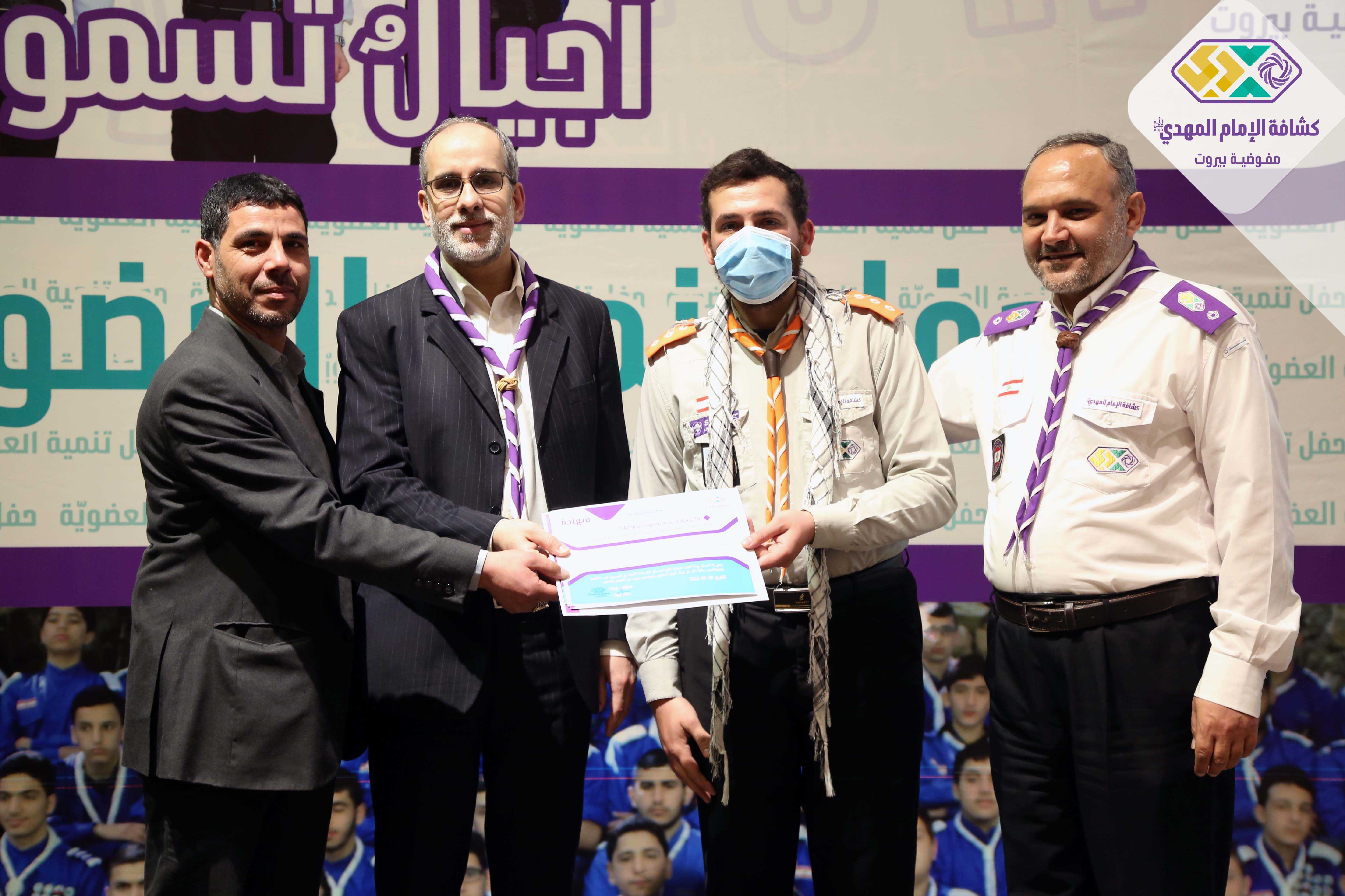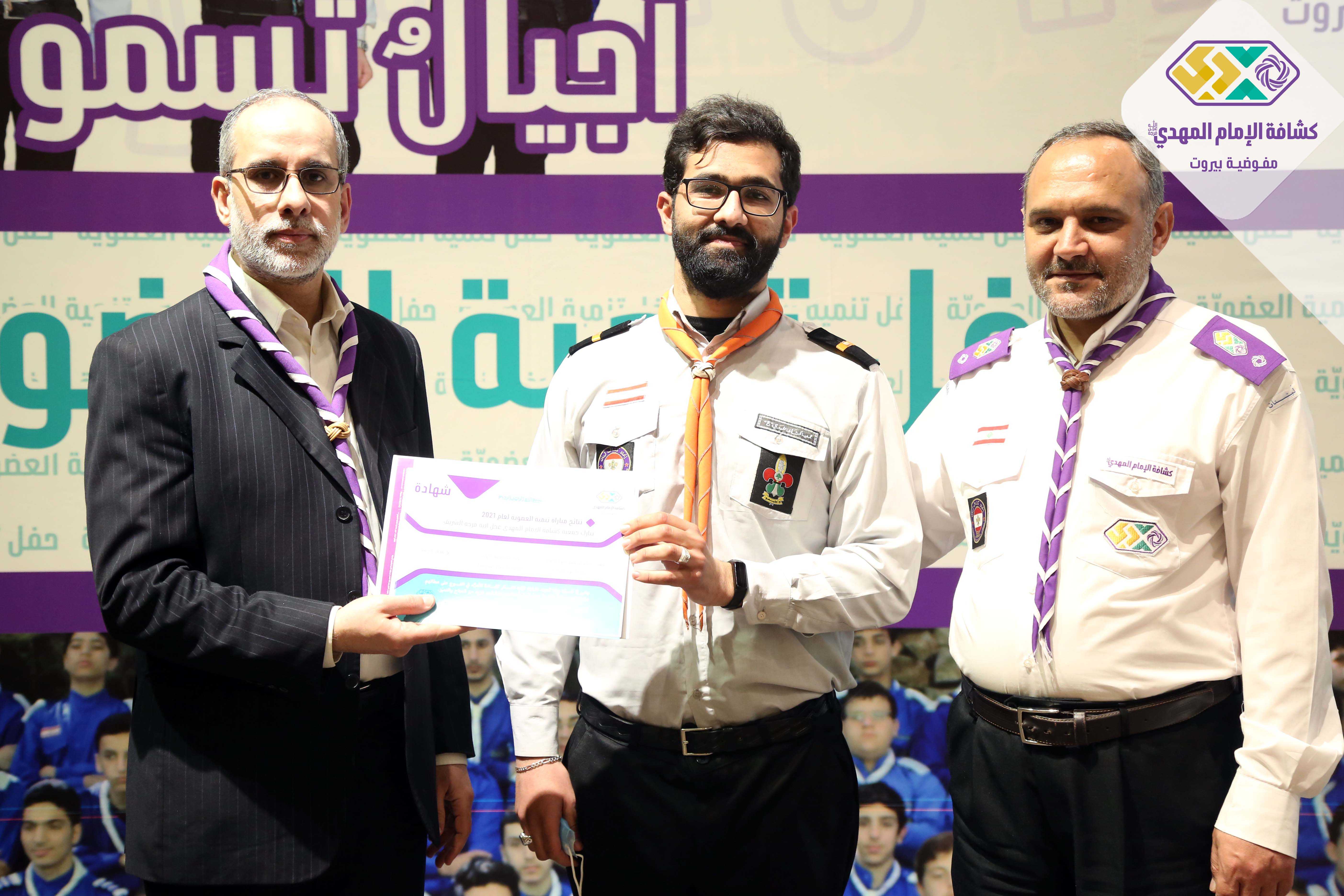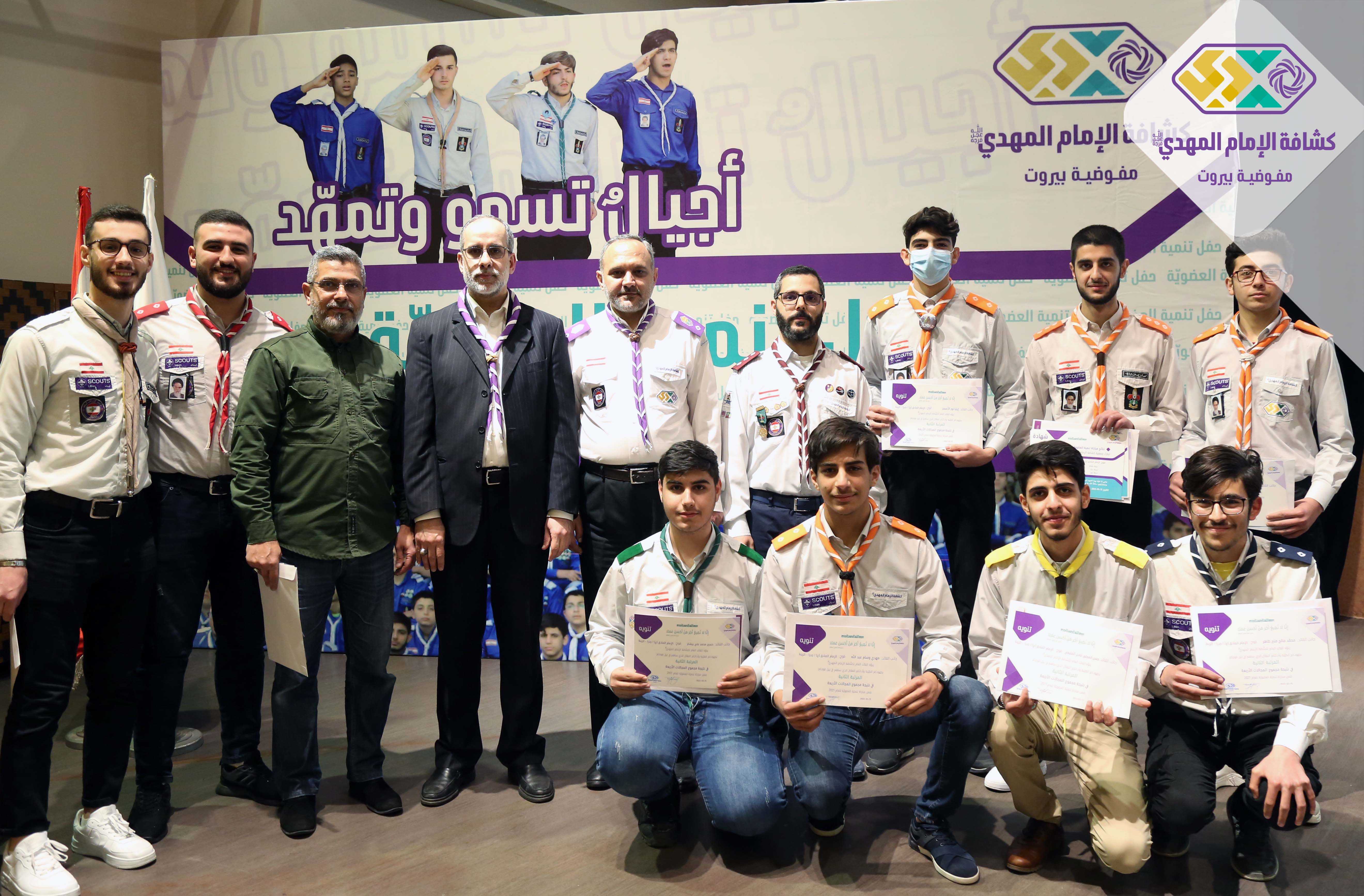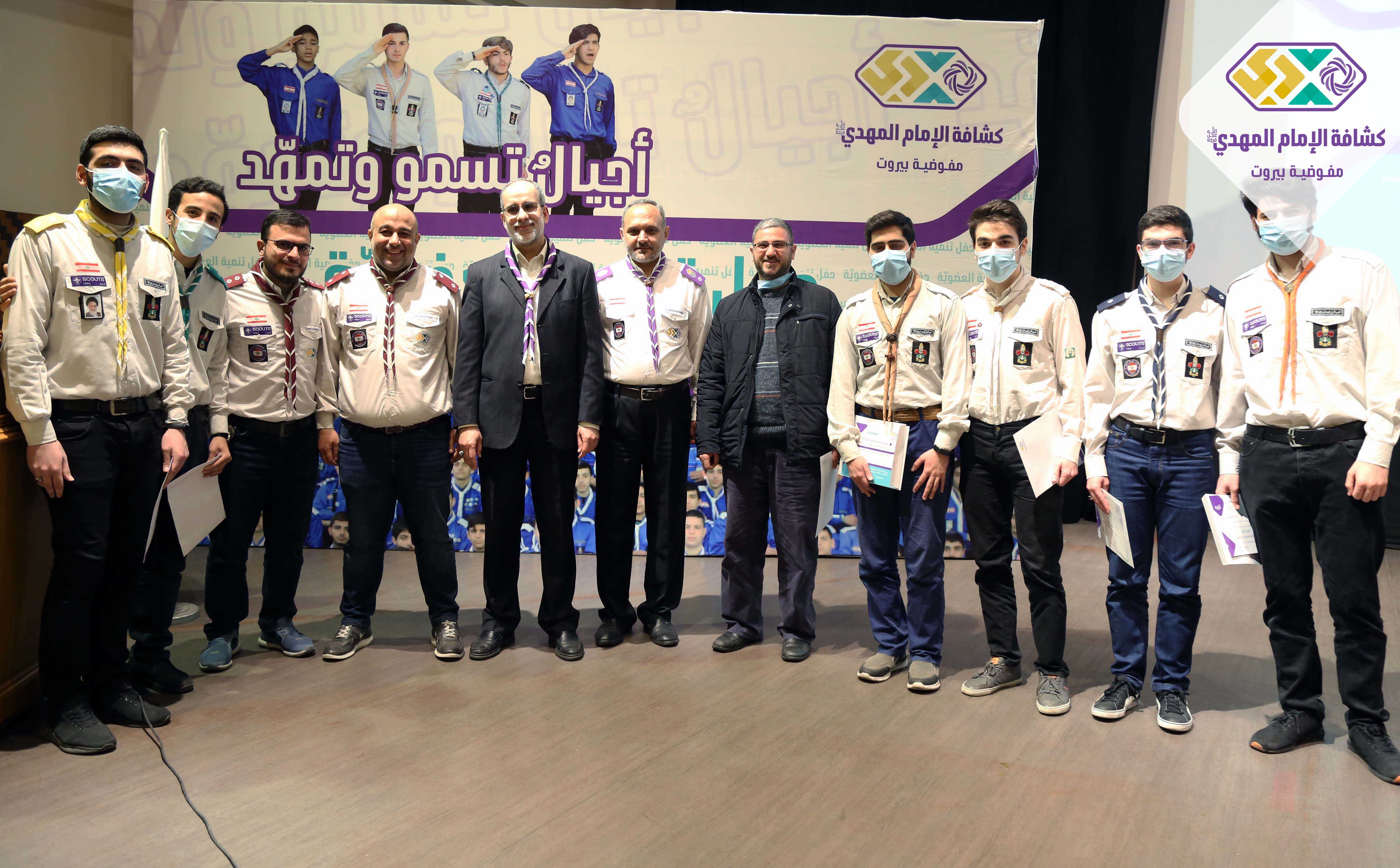 برعاية وحضور مسؤول منطقة بيروت السيد حسين فضل الله أقامت مفوضية بيروت في كشافة الامام المهدي(عج) حفل تنمية العضوية لعام ٢٠٢١ في مسرح مجمع السيدة زينب (ع) ، استهل الحفل بتلاوة عطرة للقرآن الكريم وأداء النشيدين وعرض لتقرير مصور حول أنشطة الجوالة وكلمة لمفوض بيروت الشيخ عمار جواد وبعدها كلمة راعي الحفل تضمنت تنويهاً بالجهود المبذولة وتذكيراً للقادة بضرورة الثبات والاستقامة ومؤكداً عليهم أهمية الاستقطاب كما تم التأكيد على أفواج الخدمة المجتمعية خصوصاً خلال الظروف الراهنة واختتم الحفل باعلان النتائج والحوافز على الافواج المجلية عبر توزيع شهادات التقدير لستة عشر فوج حصلوا على درجة ممتاز.