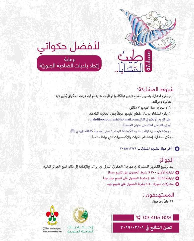 برعاية إتحاد بلديات الضاحية الجنوبية، تطلق كشافة الإمام المهدي (عجَّل الله فرجه) مسابقة "طيب الحكايا" لأفضل حكواتي.