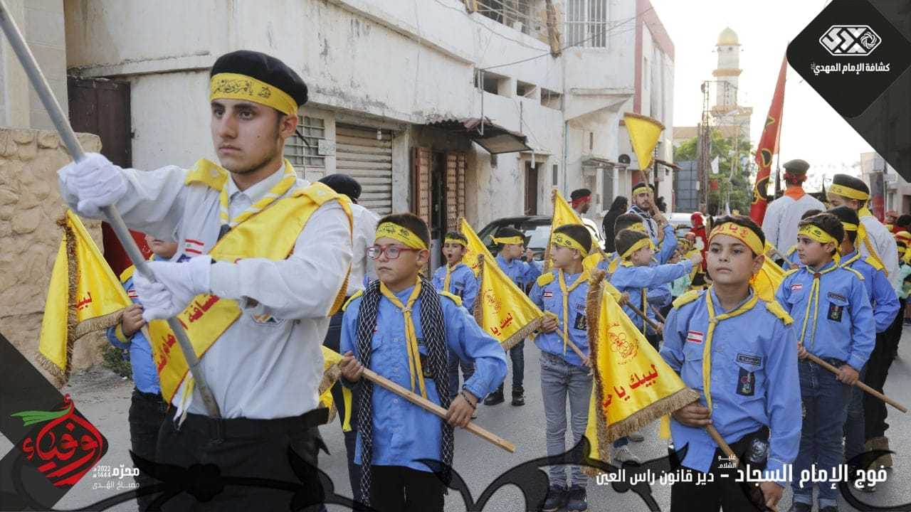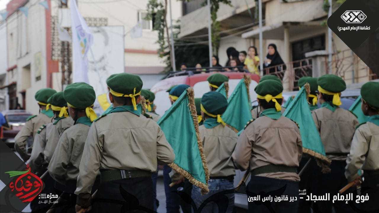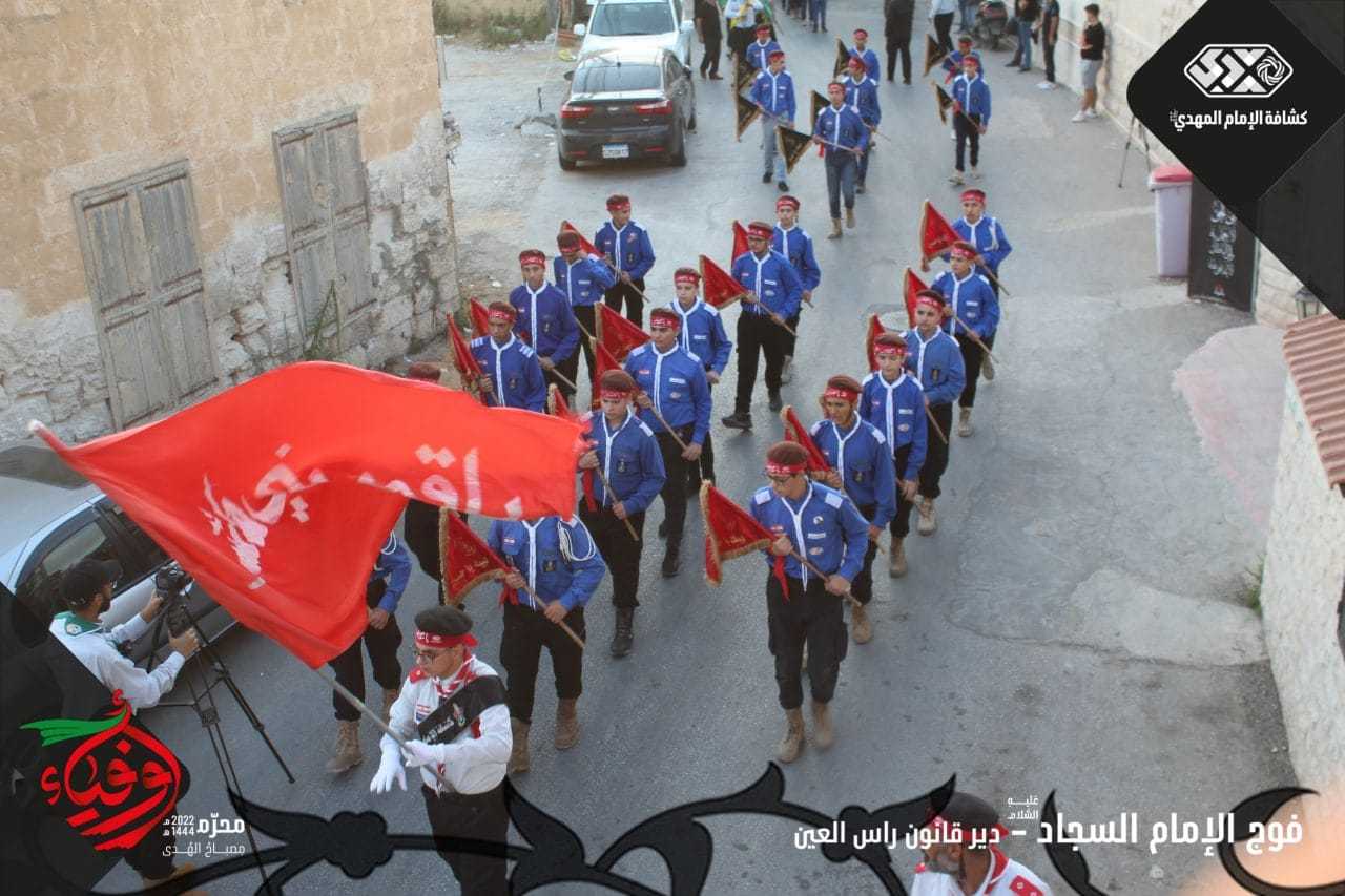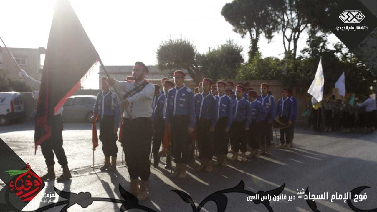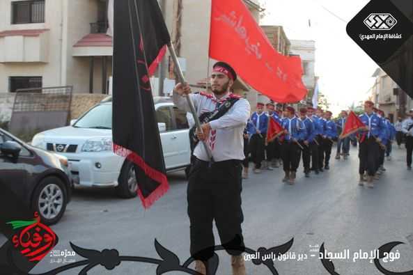 بقبضات مرفوعة لبوم النداء.وبحناجر تصدح بلبيك يا حسين ويا صاحب الزمان اجتمعوا للطم الصدور مواساة للحسين، في فوج الإمام السجاد (عليه السلام)/ ديرقانون رأس العين.