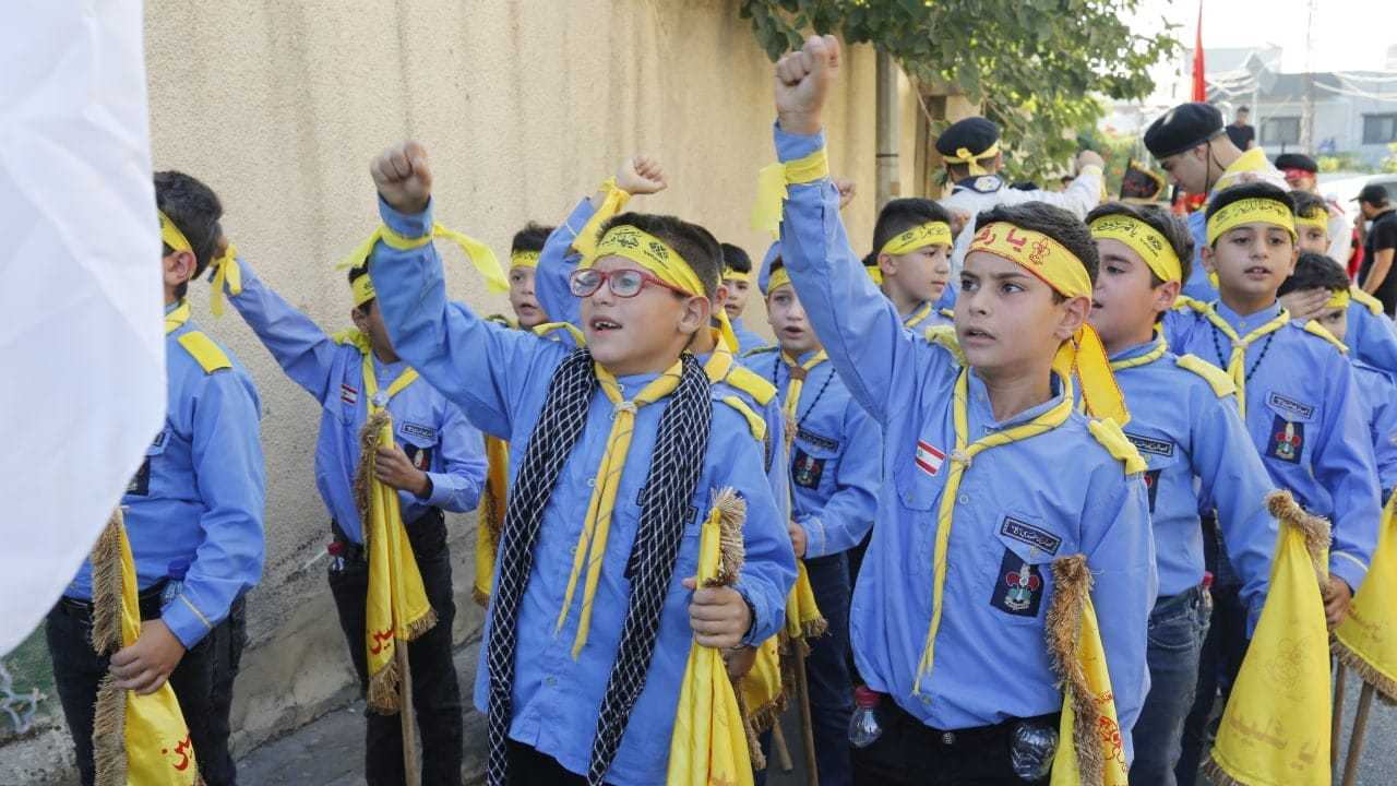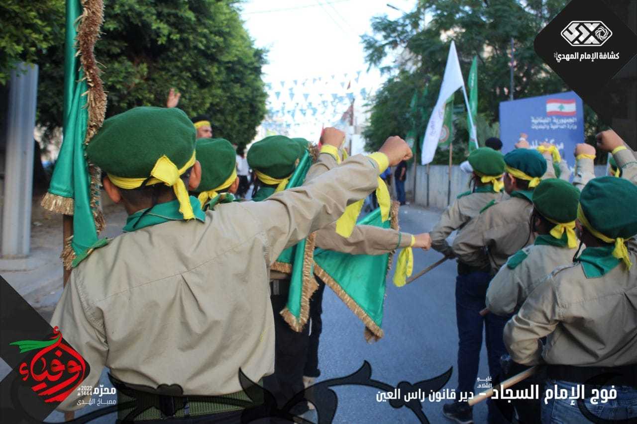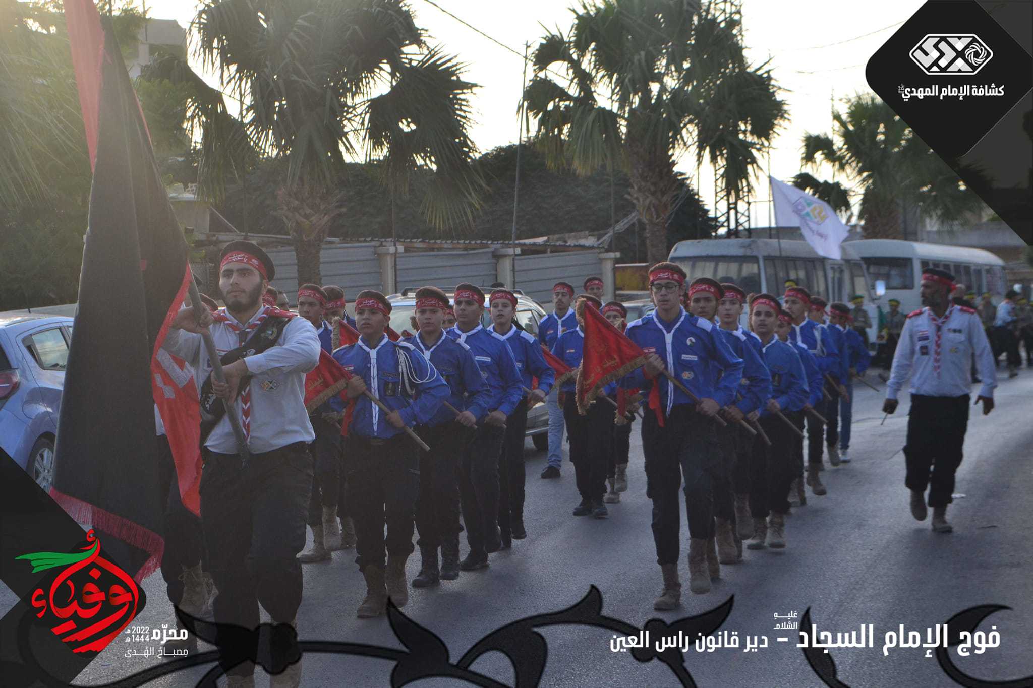 بقبضات مرفوعة لبوم النداء.وبحناجر تصدح بلبيك يا حسين ويا صاحب الزمان اجتمعوا للطم الصدور مواساة للحسين، في فوج الإمام السجاد (عليه السلام)/ ديرقانون رأس العين.