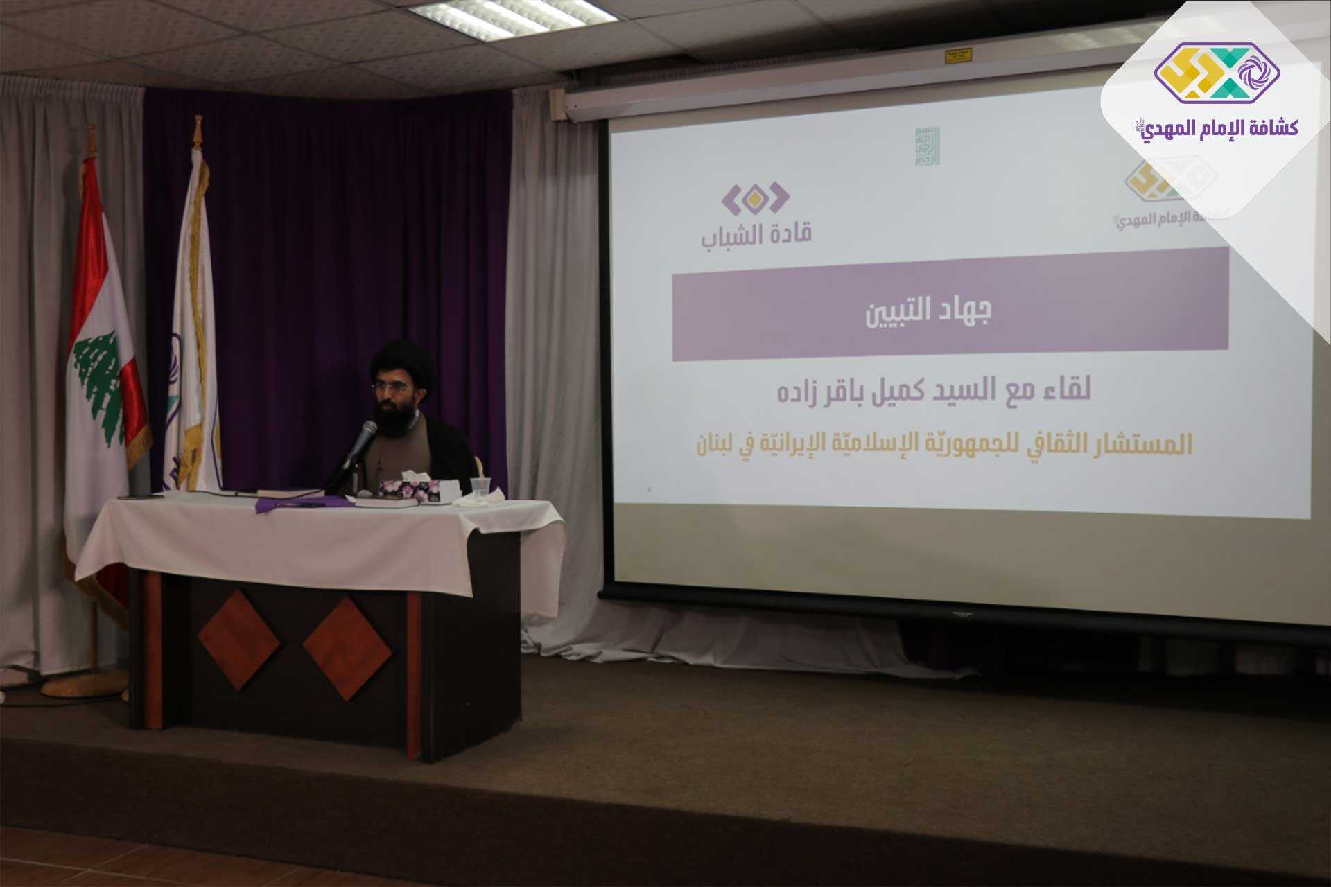 نفذت مفوضية التدريب في جمعية كشافة الإمام المهدي (عجّل الله فرجه) وضمن الفعاليات والبرامج الثقافية والتأهيلية للمشاركين في برنامج "قادة الشباب"، لقاءً ثقافياً مع المستشار الثقافي في سفارة الجمهورية الإسلامية الإيرانية في لبنان الشيخ كميل باقر زاده، تحت عنوان " جـ..هاد التبيين" وذلك في المركز الرئيسي للجمعية - بئر حسن.