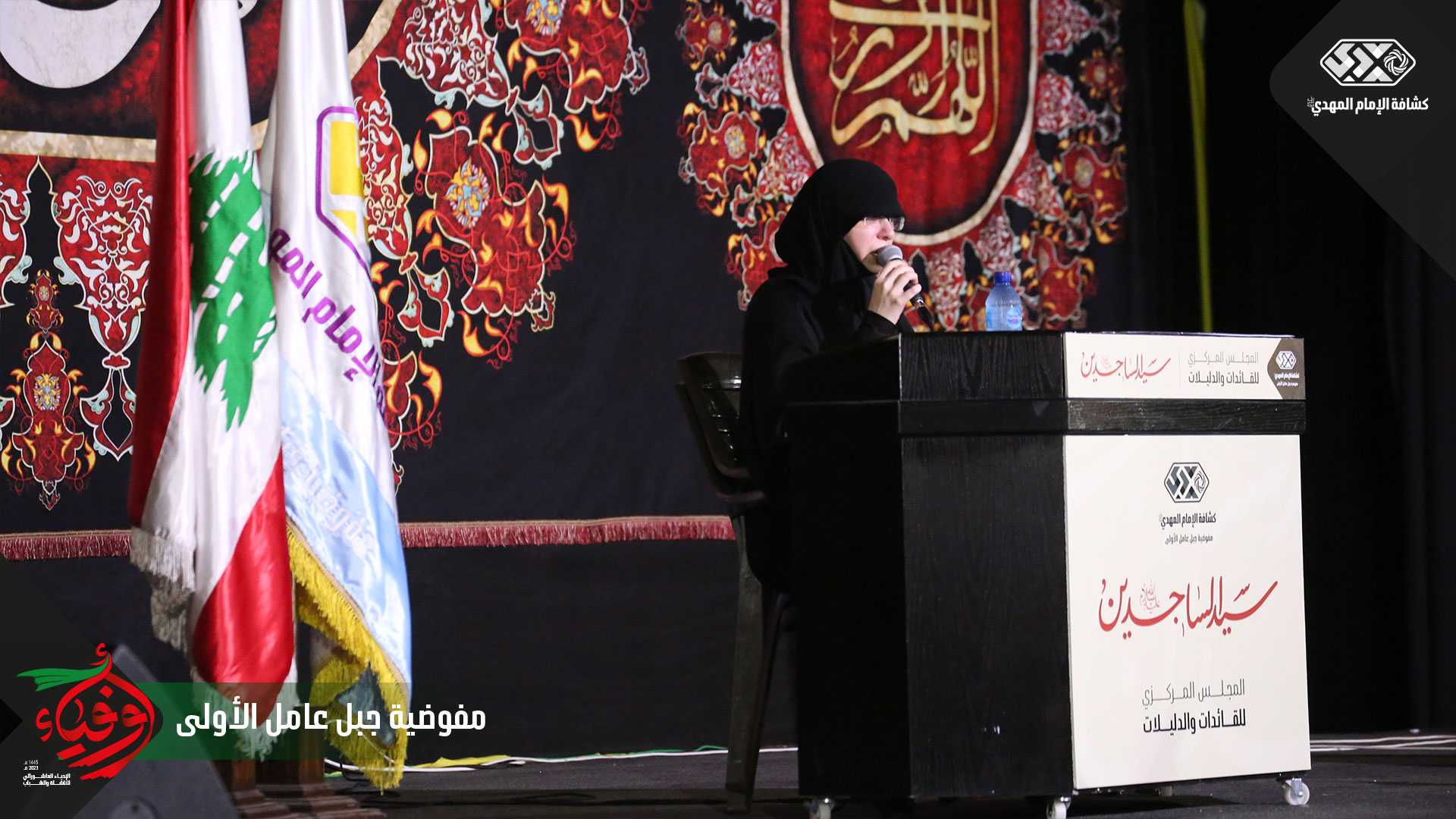 1700 قائدة ودليلة أحيين ذكرى شهادة لإمام زين العابدين (عليه السلام)، وحضرن في المجلس المركزي الذي أقامته مفوضية جبل عامل الأولى للقائدات والدليلات بـعنوان "يا سيد الساجدين" وذلك في قاعة قمر بني هاشم /حاريص.