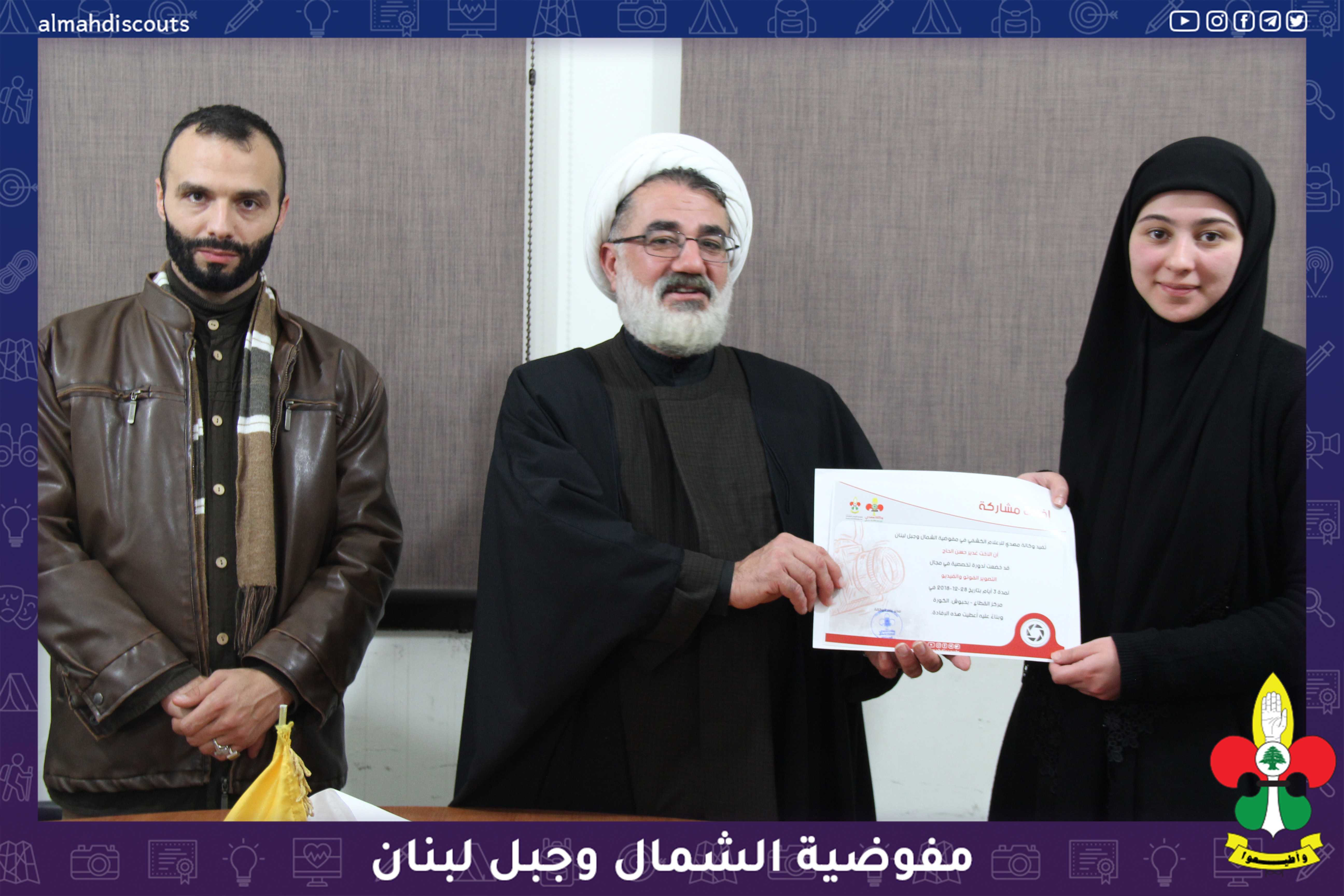 بحضور ورعاية مسؤول حزب الله في الشمال الشيخ رضا احمد اختتمت وكالة مهدي للاعلام الكشفي مفوضية الشمال وجبل لبنان دورة التصوير الفوتو والفيديو التي اقامتها في منطقة الكورة الشيخ رضا الذي تحدث عن دور الاعلام واهميته في نشر ثقافة اهل البيت عليهم السلام وختاما بتوزيع الافادات على المشاركات