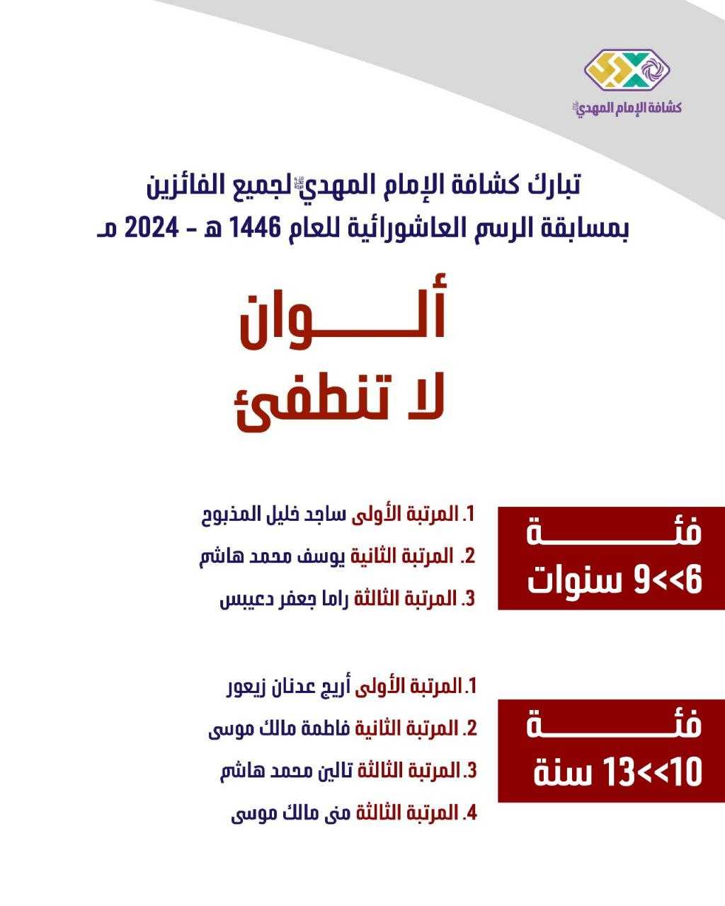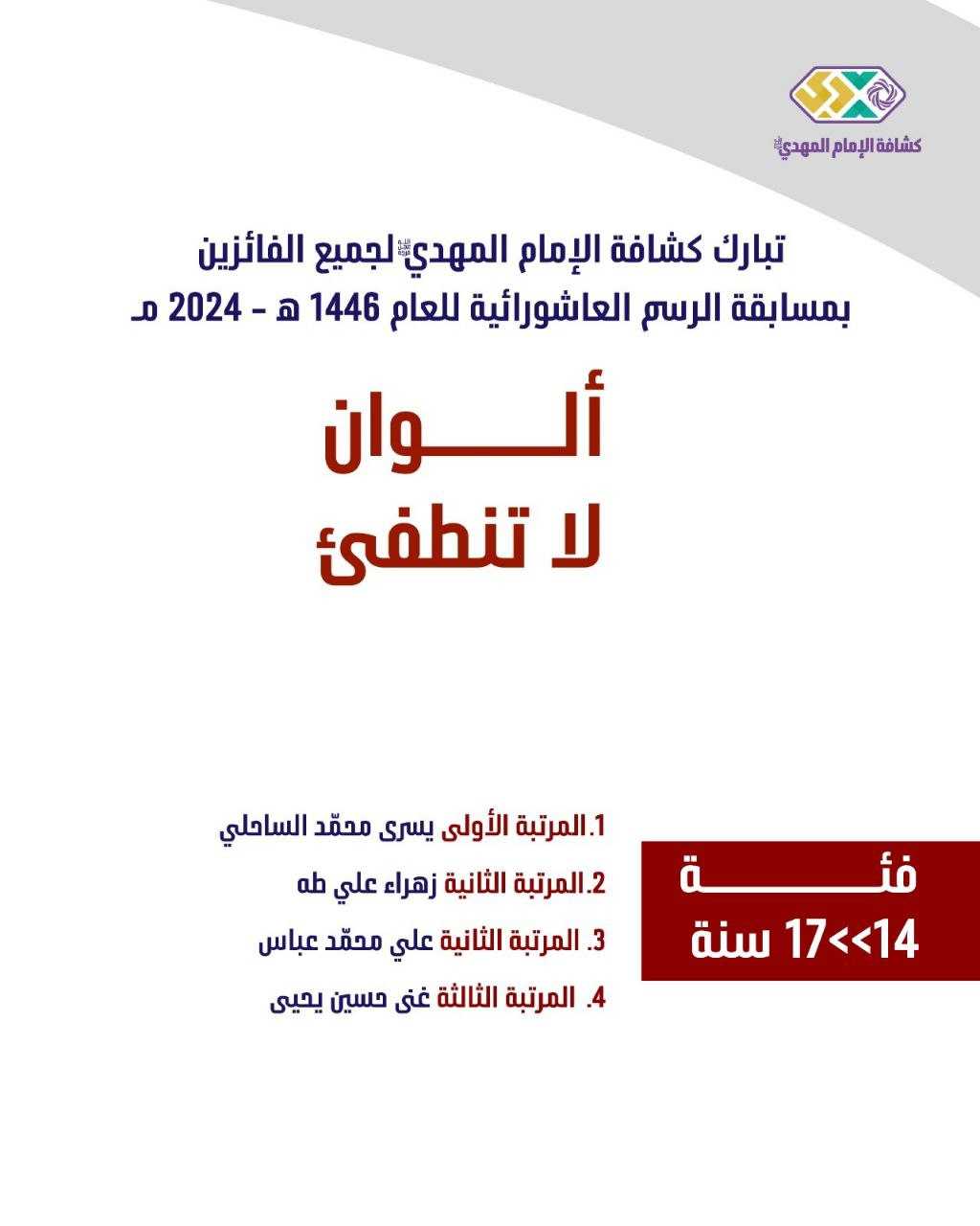 تتشرف مفوضية الفنون والمواهب بالإعلان عن نتائج مسابقة الرسم العاشورائية في دورتها الخامسة عشر، والتي حملت اسم "ألوان لا تنطفئ" هدفت المسابقة إلى إحياء معاني عاشوراء بعيون الموهوبين، وتجسيد القيَم الإنسانية من خلال الفن والإبداع.