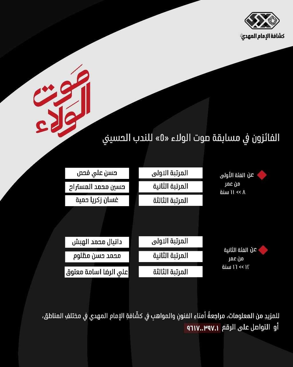 في أجواء أربعينية الإمام الحسين(ع) اختتمت مفوضية الفنون والمواهب مسابقة الندب الحسيني "صوت الولاء ٥" حيث عقدت اللجنة المختصّة بالمفوضية بمشاركة مدير ملتقى سيد الشهداء الندب الحسيني الحاج محمد نايف، وقامت بتقييم المشاركات وقد جاءت النّتائج على الشكل التالي :
