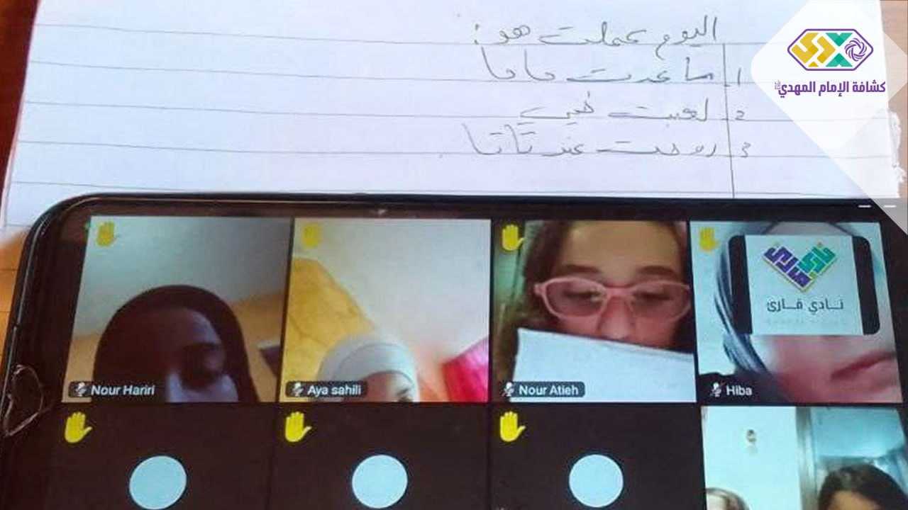 «فاطمة تحسّن من نفسها» عنوان لقاء أقامه نادي قارئ لفئتي الصغار والفتية والفتيات، افتُتح بتلاوة قرآن كريم من المنتسبين، ومن ثم كانت الحكاية التي ناولت قصة فاطمة التي تعلمّت كيف تحاسب نفسها يوميًّا وتطوّر من أعمالها الحسنة، وفي الختام عرض المشاركين أعمالهم الحسنة التي فعلوها خلال اليوم.